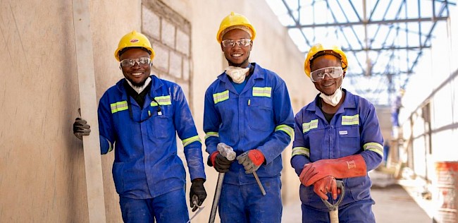 (L-R) Sipamba Mwamba, Kasaola Ilunga and Elie Ngoie Tshisola working on masonry at the new Kamoa hospital.
