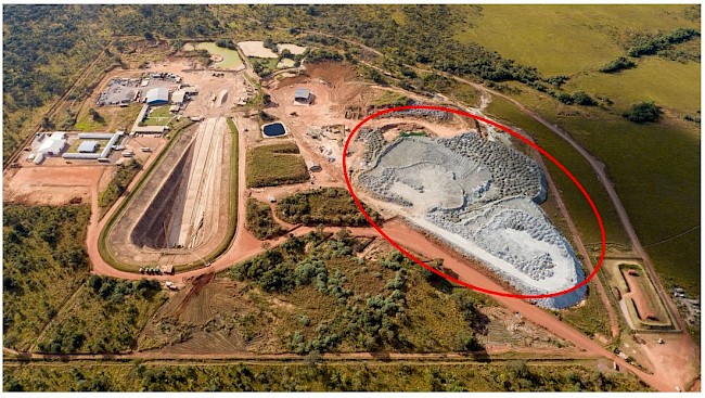 Stockpiled ore being loaded into the Bulk Reclaim Tip. The run-of-mine stockpile is in the upper right corner.