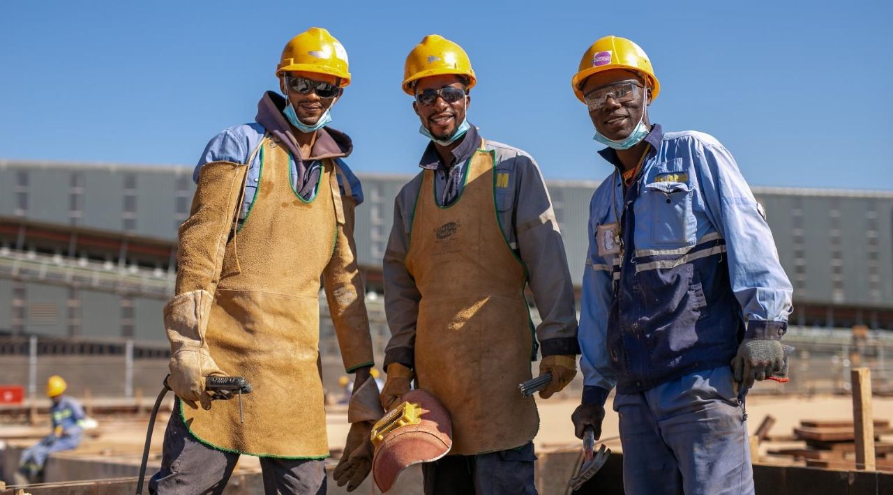 (L-R) Tresor Kilolo Mpiana, Joyce Lenge Kabange, and Japhet Kibonge constructing the Phase 2 concentrator at Kamoa-Kakula.
