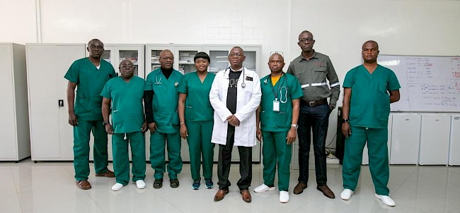 (L-R) Richard Lubuku Lutchimba, Medical Doctor; Fabrice Manengo Sengey, Senior ICU Nurse; Felly Kindoki Mpangulula, Medical Doctor; Delvareine Kabwayi Buyamba, Junior Doctor; John Botomwito Ikombele, Head of Health; Albert Odimboleko, Medical Doctor; Patrick Kasongo Ngoyi, Occupational Health Coordinator; and Timothee Bwana Ngoie, ICU Nurse, at the Kamoa hospital.