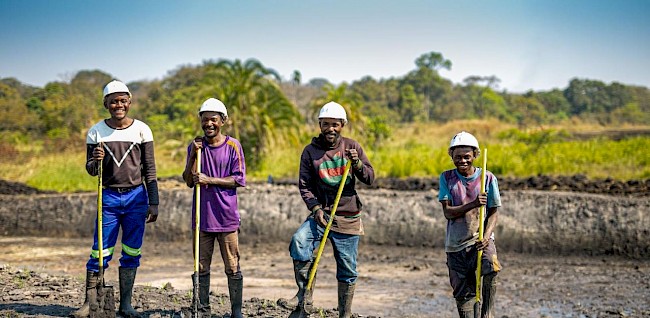 (L-R) Prince Nayisanga, Jose Nyembo, Delphine Mtambwe and Chretien Mutinga constructing new fishponds near Kamoa-Kakula.