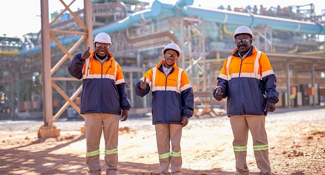 (L-R) Control room supervisors Herribert Nyange, Jean-Claude Katanga and Jack Tambwe standing in front of Kamoa-Kakula’s Phase 1 concentrator plant.