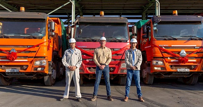 First concentrate transport to Lualaba Copper Smelters (LCS) in Kolwezi on June 1, 2021. (L-R) Yang Wei, CEO, LCS; Rochelle de Villiers, CFO, Kamoa Copper SA; and Dong Ming, Deputy General Manager, LCS.