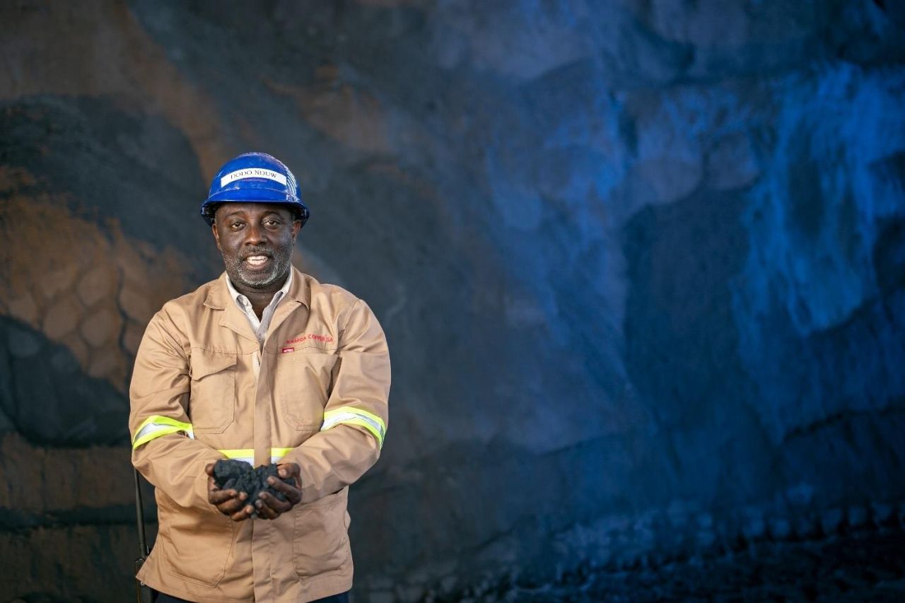 Dodo Mbay, Head of Processing, with a handful of copper concentrate inside the Kamoa-Kakula concentrator storage building.