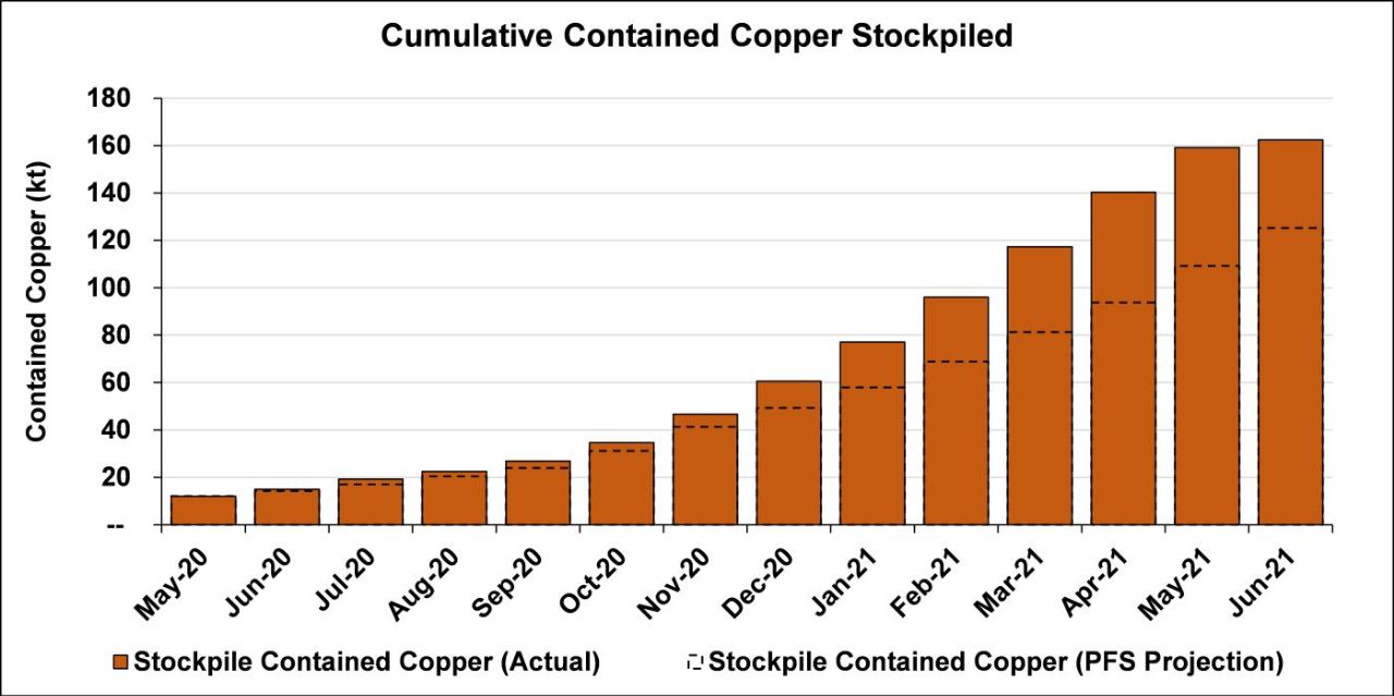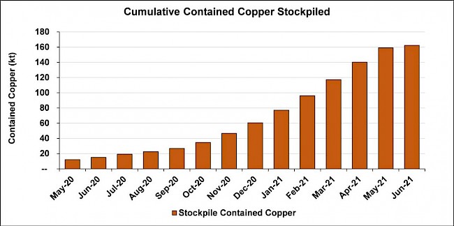 The project’s pre-production surface stockpiles now contain approximately 3.4 million tonnes of high-grade and medium-grade ore at an estimated, blended average of 4.78% copper. Contained copper in the stockpiles at the end of May now totals more than 162,000 tonnes (the current copper price is approximately US$9,430 per tonne).