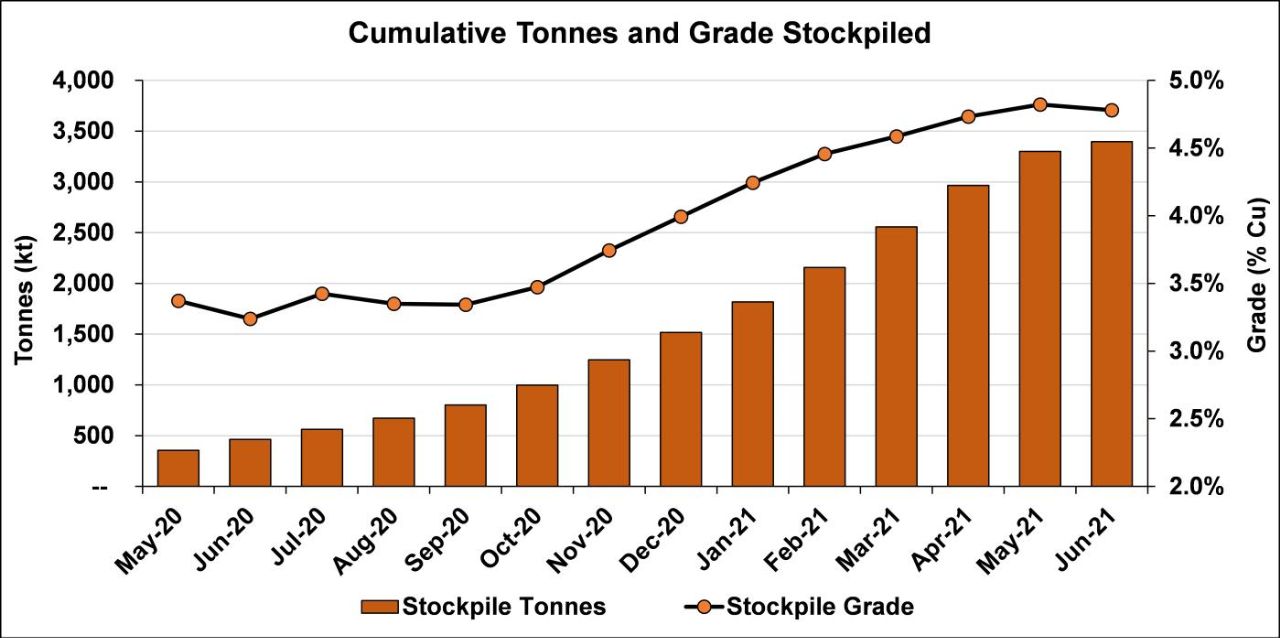 Pre-production ore stockpiles total 3.4 million tonnes grading 4.78% copper