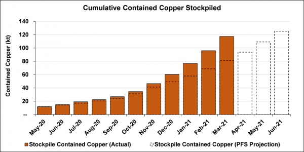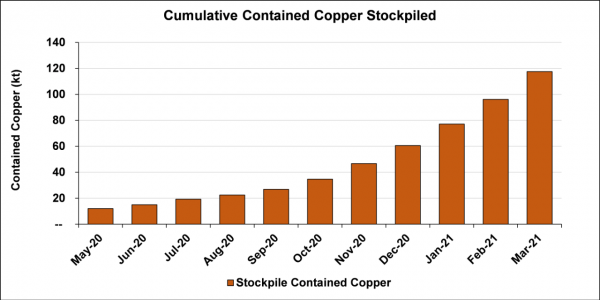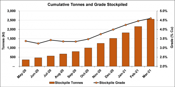March’s ore production was 18% higher than February at slightly lower grades; pre-production surface ore stockpiles now total approximately 2.56 million tonnes grading 4.60% copper