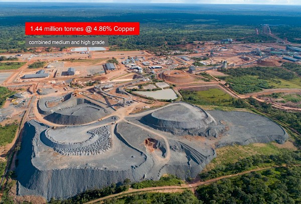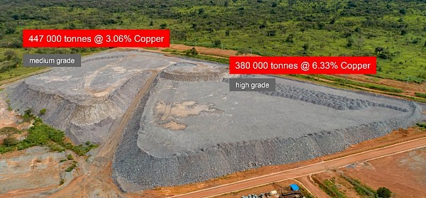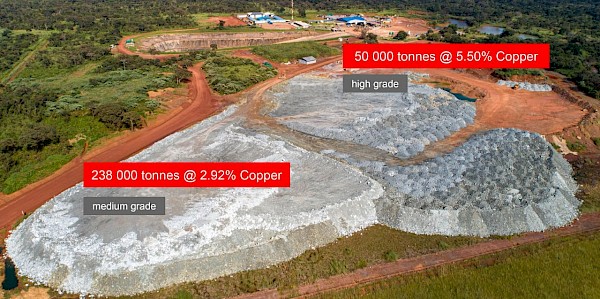 Kansoko decline blended ore stockpiles containing 287,000 tonnes grading 3.37% copper (consisting of 50,000 high-grade tonnes @ 5.50% copper and 238,000 medium-grade tonnes @ 2.92% copper).