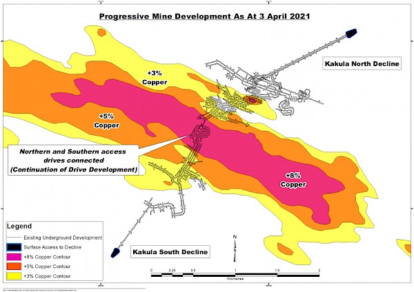 Figure 1: Underground development completed at Kakula Mine to April 3, 2021 (in black).