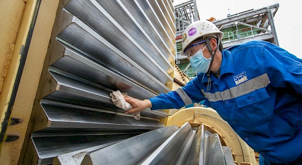 Hong Wang, Mechanical Fitter, checking the alignment of pinion and girth gears of the primary ball mill during commissioning of the Phase 1 concentrator plant.