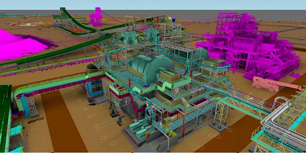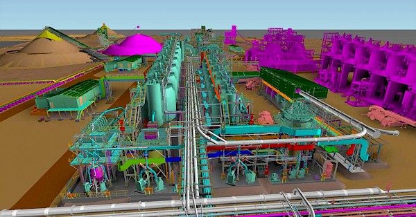 A 3D illustration of the finished ball mills area for the Phase 1, 3.8 Mtpa concentrator, with the next two ball mills for the Phase 2 concentrator plant shown in magenta. The picture immediately below shows the current construction progress.