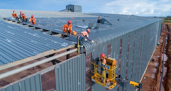 Contractors installing metal sheeting on the concentrate storage building.