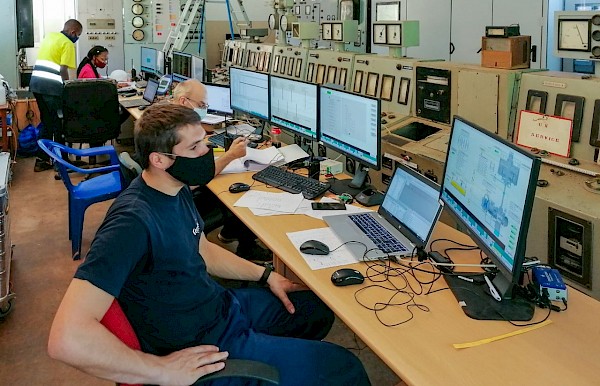 Electrical engineers from Andritz Hydro of Switzerland, CEGELEC of France, and the DRC’s Société Nationale d’Electricité (SNEL), monitoring the commissioning of Mwadingusha’s turbines 2 and 3 from the control room. Commissioning of turbine 6, the fourth in the sequence of commissioning, is scheduled to start in mid-April.
