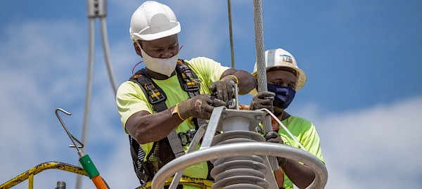 Yves Tshivuadi, Cherry Picker Operator, and Idriss Bibwe, Mechanic Fitter, connecting a surge arrestor and voltage transformer at Kamoa-Kakula’s main 220-kV substation.