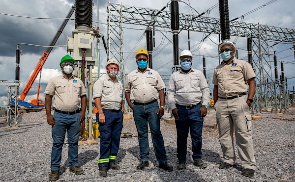 Members of SNEL’s senior management and senior members of Kamoa Copper at the energized Kakula 220-Kv substation. From left to right: Kayembe Bukasa Cedric, Divisional Head, Communications, SNEL; Johan Nortje, Engineering Manager, Kamoa Copper; Doudou Bakutu, Divisional Head of Protection & Metering, SNEL; Chris Kabongo, Senior Engineer, Kamoa Copper; and Gilbert Tshilumba, Divisional Head of High Voltage Customers, SNEL.