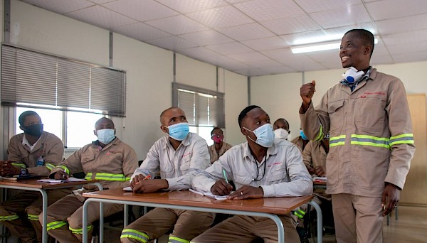 Fabrice Mitonga, Process instructor (right), with a class of new recruits that will be operating the Phase 1 concentrator plant.