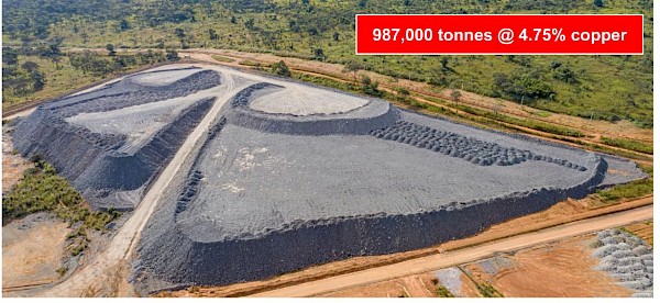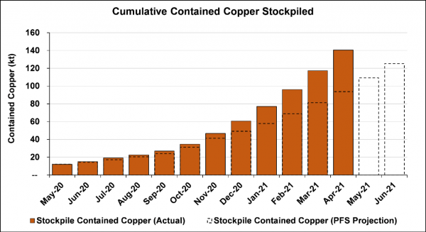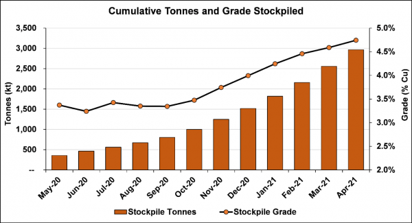 Pre-production ore stockpiles now hold three million tonnes grading 4.74% copper, containing more than 140,000 tonnes of copper