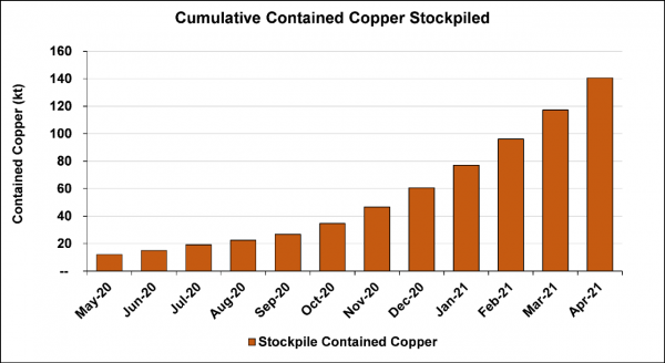 Contained copper in the stockpiles increased by approximately 23,000 tonnes in April – to a cumulative total of more than 140,000 tonnes (the current copper price is approximately US$9,950 a tonne).