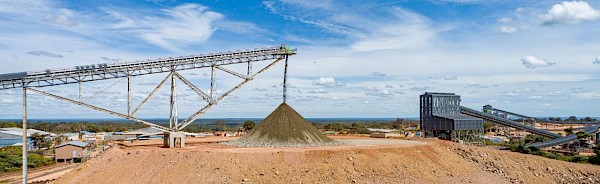 Low-grade ore from surface stockpiles being conveyed to the run-of-mine ore stockpile, to be used in early commissioning of the concentrator plant.