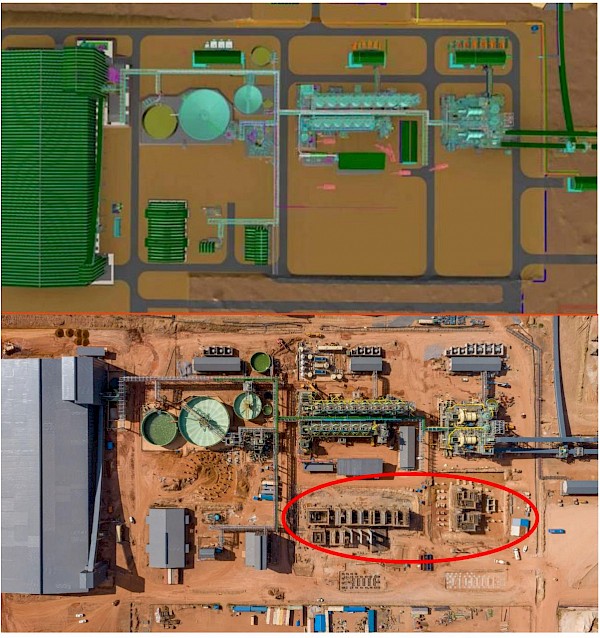 A 3D overhead illustration of the finished Phase 1, 3.8-Mtpa concentrator plant. The picture below shows that construction is essentially complete. Foundations for the Phase 2 concentrator ball mills and flotation cells are circled in red