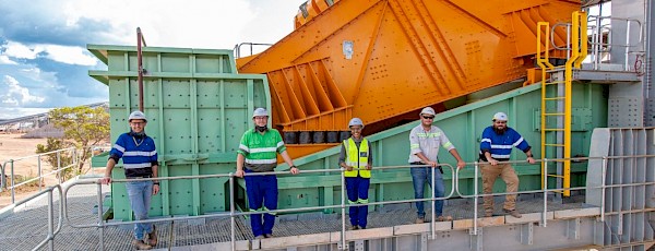 Commissioning of the crushing and screening plant vibrating screen. L-R: Ernest de la Hunt (Mechanical Engineer, DRA); Morne Kruger (Project Manager, DRA); Kelebogile Choku (Process Engineer, DRA); Aldo Groenewald (Commissioning Manager, DRA); and Thys de Beer (Senior Project Manager, DRA).