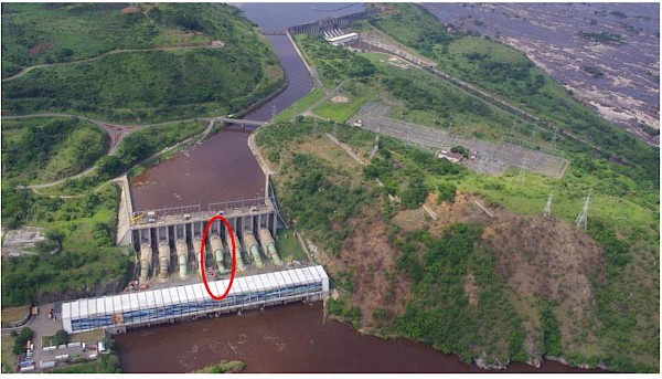 Turbine 5 (penstock circled in red) at the Inga II hydropower complex is expected to generate an additional 162 megawatts of clean power after upgrading.