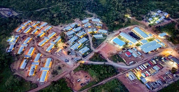 Overhead view of the Kakula Village workers’ accommodations at dusk.