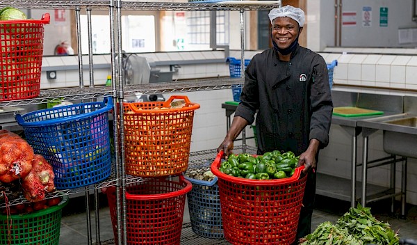 Serge Lumbal, a cook at the Kamoa staff kitchen, with fresh vegetables produced from local community farms – one of Kamoa-Kakula’s local procurement initiatives.