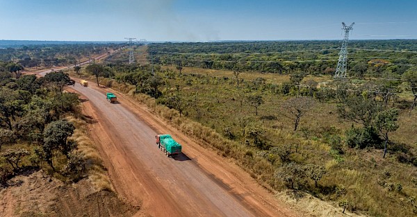 Trucks transporting bulk copper concentrate from the Kamoa-Kakula Project to the Lualaba Copper Smelter via the recently-completed by-pass road connecting Kamoa-Kakula to Kolwezi. The new 220-kilovolt powerline carrying clean hydro-generated electrity to Kamoa-Kakula is on the right.