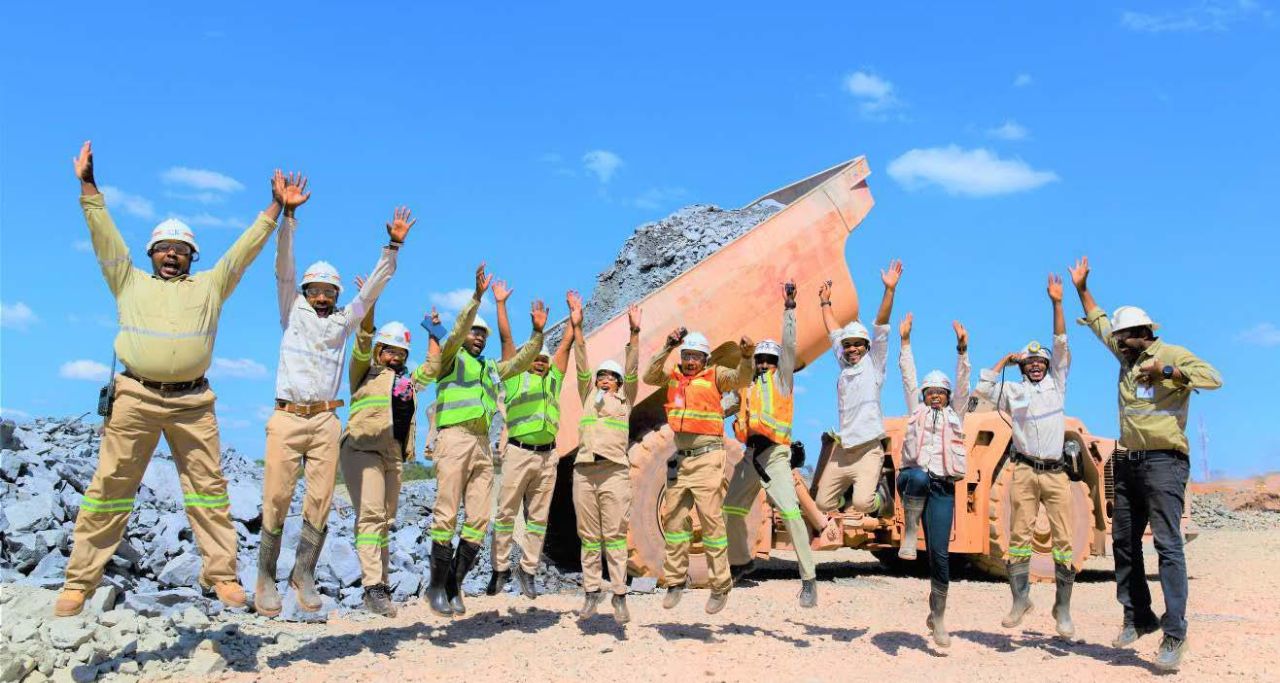 Members of Kamoa-Kakula’s multi-national team of geologists and engineers that is helping to build the Tier One Kakula Mine, in front of the mine’s high-grade ore stockpile that is expected to grow to approximately 1.5 million tonnes prior to the start of production.