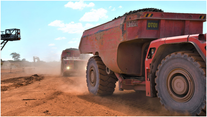 Two of Kakula’s 63-tonne dump trucks hauling ore to the high-grade stockpile.