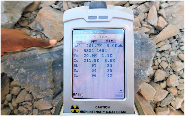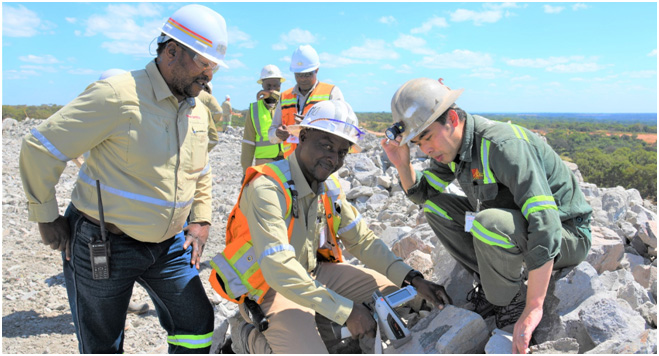 (L-R) Magloire Kashiba (Production Manager), Didier Masengo (Senior Mine Geologist) and Qiao Wei (JMMC Production Manager) examine samples of ore on the high-grade stockpile with a portable Niton analyzer (X-ray fluorescence).
