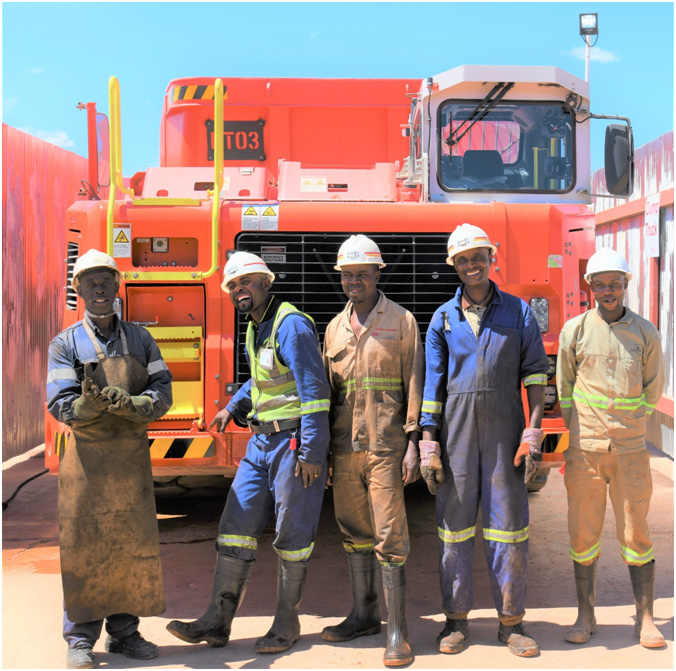 (L-R) Saphot Kabangue (Boilermaker), Tresor Mwangal (Mechanical Assistant), Gustave Kasonde (Mechanical Assistant), Pierre Katshitshi (Tyre Technician) and Motheba Katayi (Environmental Services) in front of one of Kakula’s new 63-tonne Sandvik dump trucks in the newly commissioned mining fleet wash bays.
