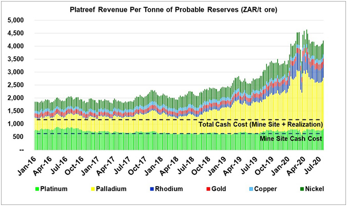 Revenue per tonne of ore at the Platreef Project in South African Rand near all-time highs
