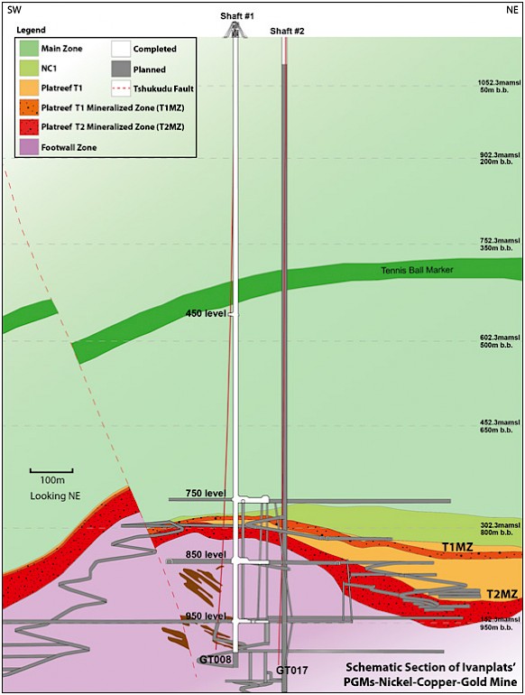 Figure 3: Schematic section of the Platreef Mine, showing Flatreef’s T1 and T2 thick, high-grade mineralized zones (red and dark orange), underground development work completed to date in shafts 1 and 2 (white) and planned development work (gray).